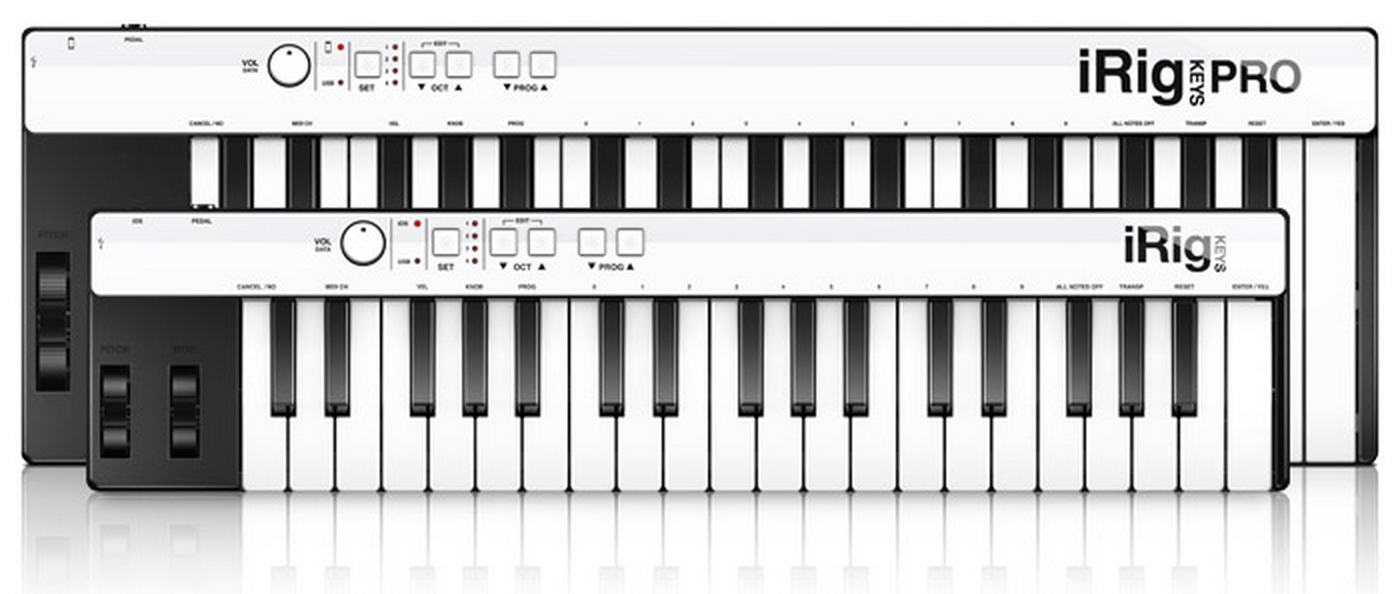 iRig KEYS and iRig KEYS PRO from IK Multimedia, affordable mobile MIDI controllers with USB, 30-Pin and Lightning adapters.